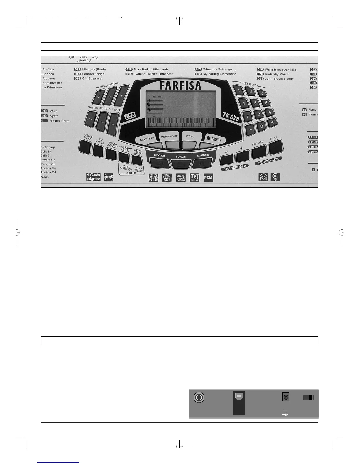 SELECT 0-9 and +/– - Selects functions, rhythms, songs