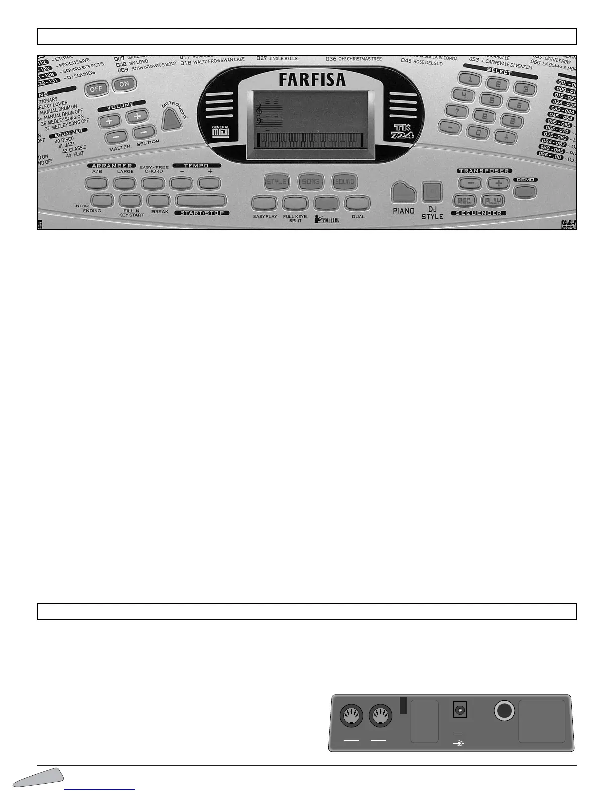 SELECT 0-9 and +/– - Selects functions, rhythms, songs