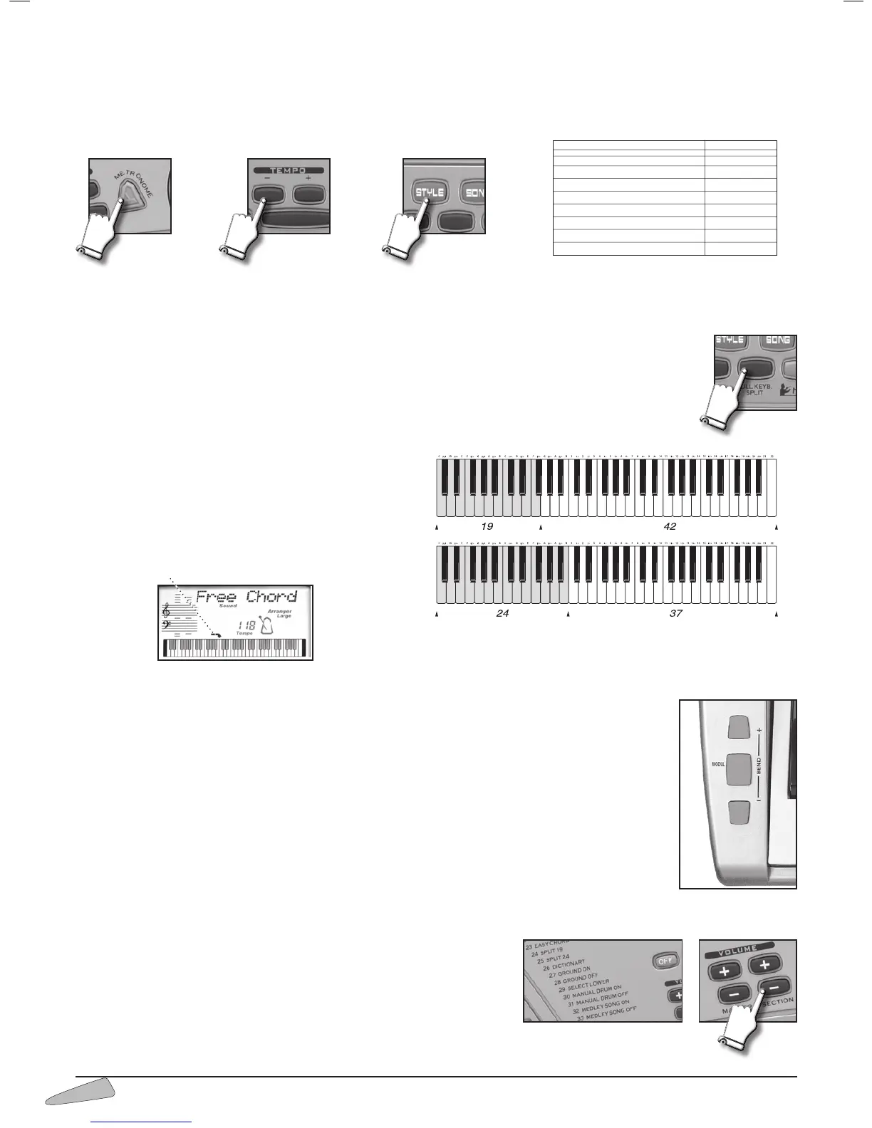 1. When simply turned on, one single sound is enabled over the whole keyboard, together with the chord identi-