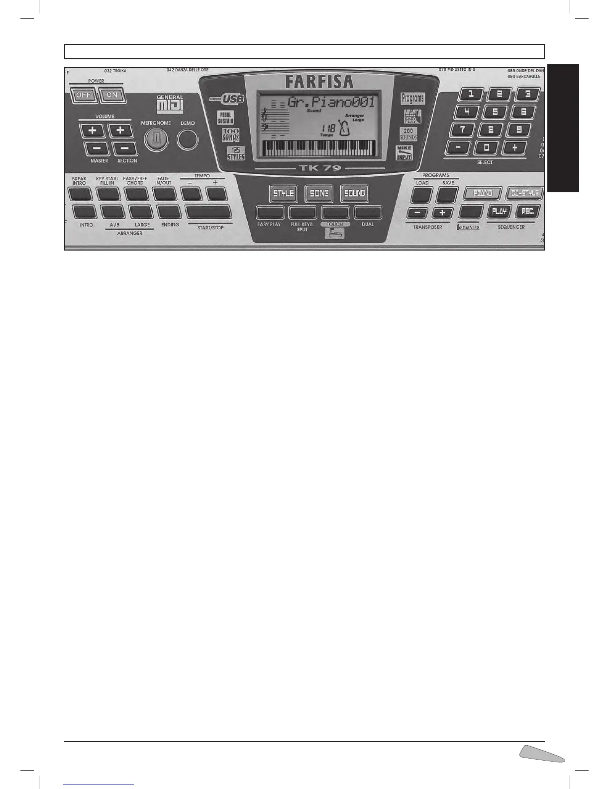 SELECT 0-9 and +/– - To select functions, rhythm styles,