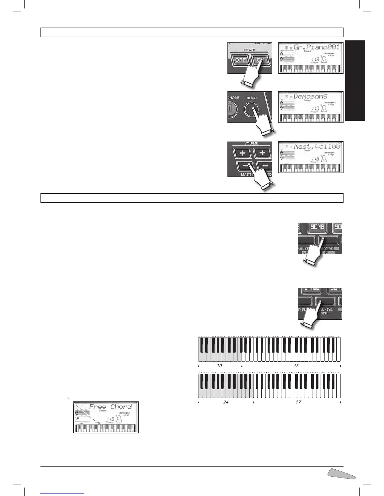 2. By pressing the FULL KEYB/SPLIT button, the keyboard will be divided into two sections: one dedicated