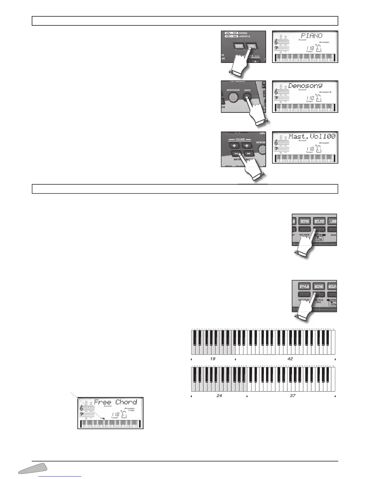 1. When simply turned on, one single sound is enabled over the whole keyboard, together with the chord
