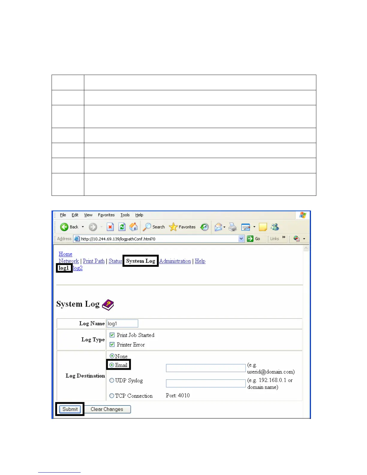 3 Select the Email radio button to choose email log notification.