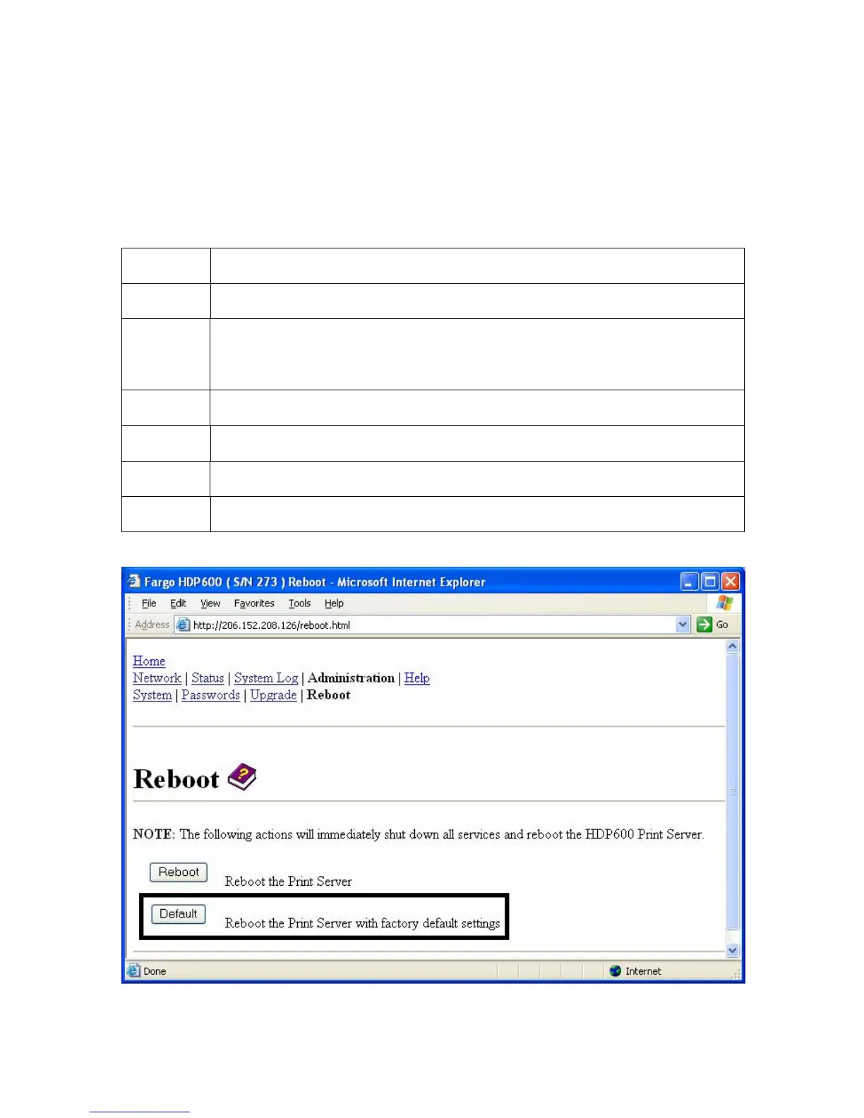 The Reboot page also allows the User to reboot the Ethernet Print Server into a default