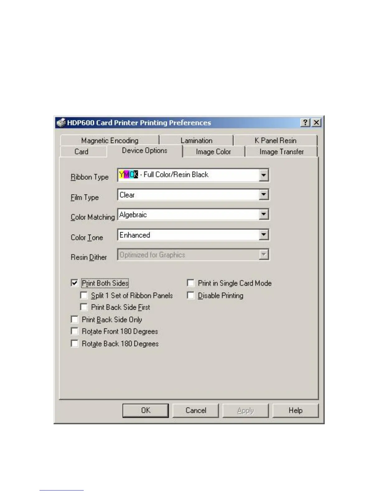 The HDP600 Printing Preferences window is used throughout this section for consistency