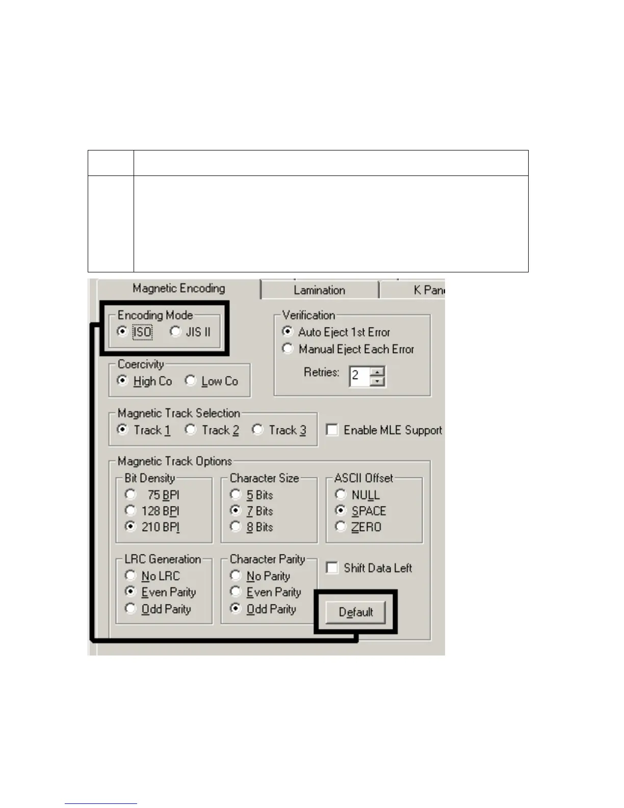 default ISO Magnetic Track Options should be correct for most applications.
