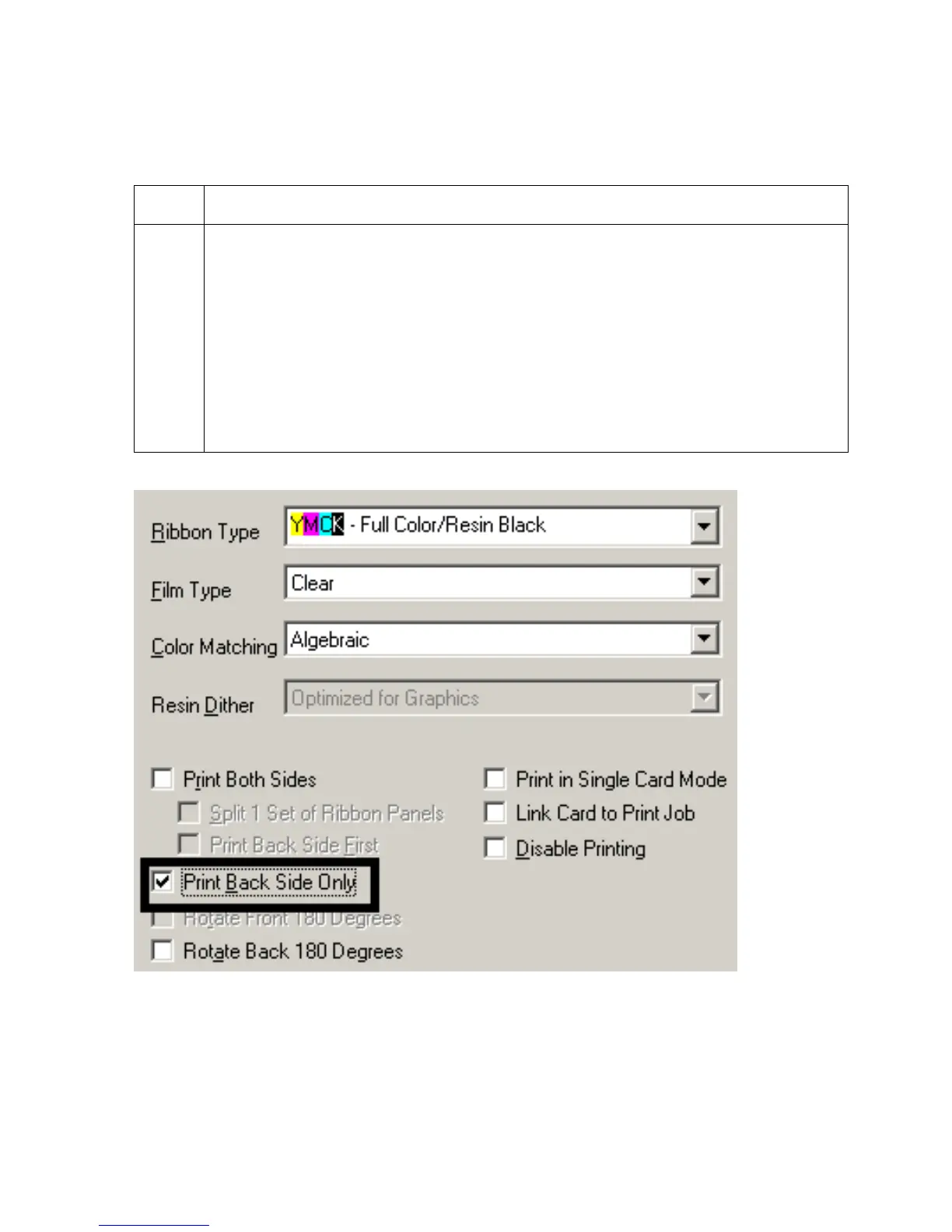 1 Select this option to print only onto the backside of preprinted cards that must have