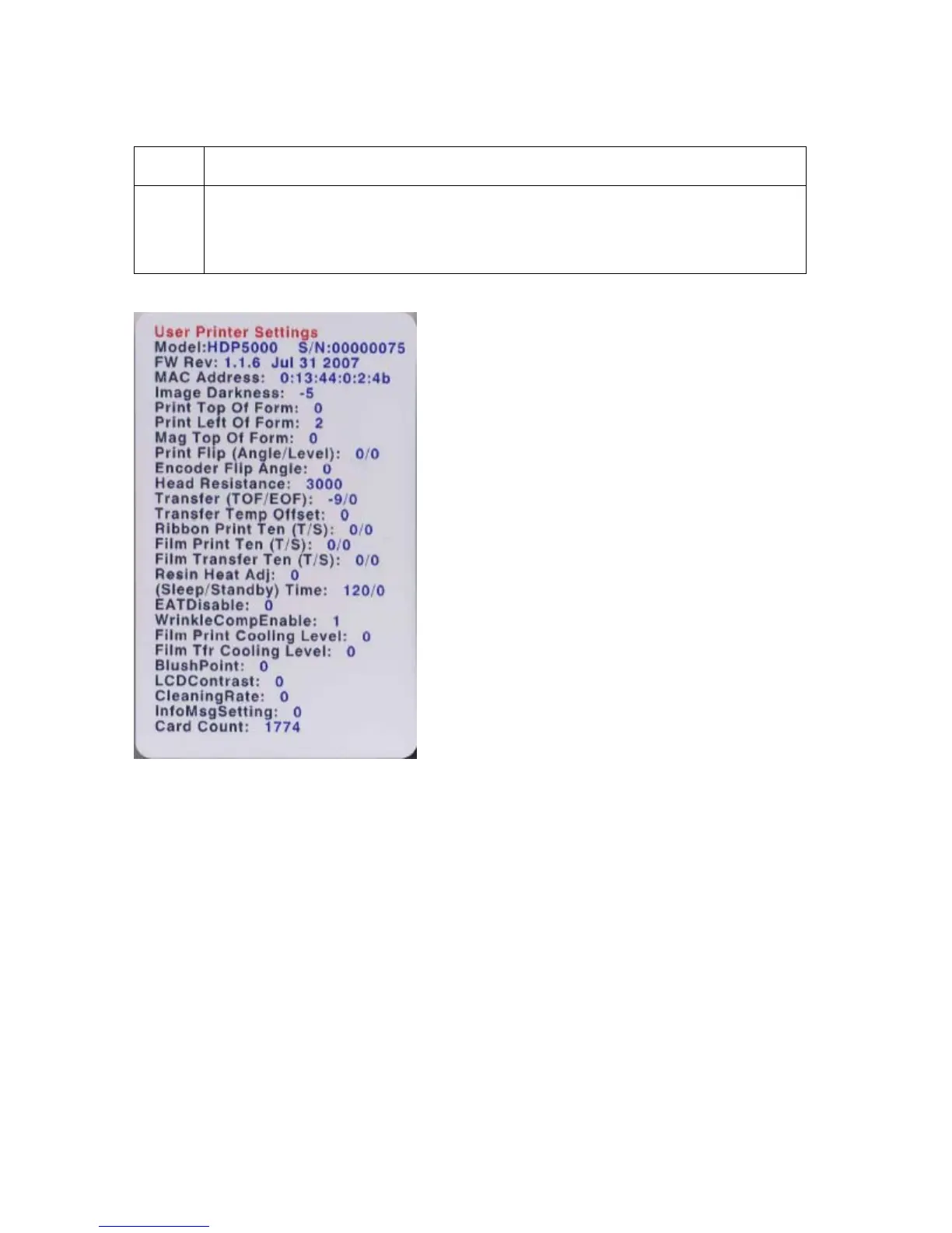 1 Use this card to view the Printer settings and counts for Card Count (CC),