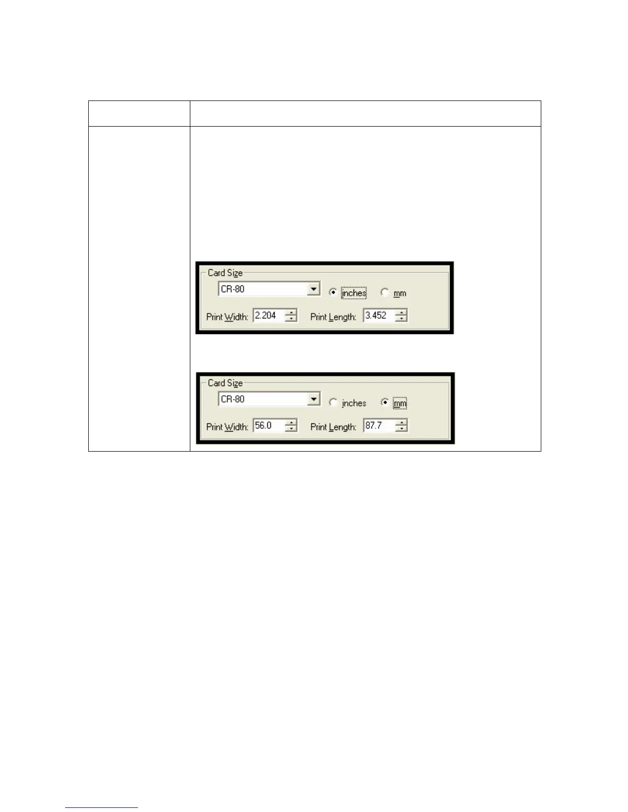 • CR-80 (default values): Card Size supported is 2.204 in. W X