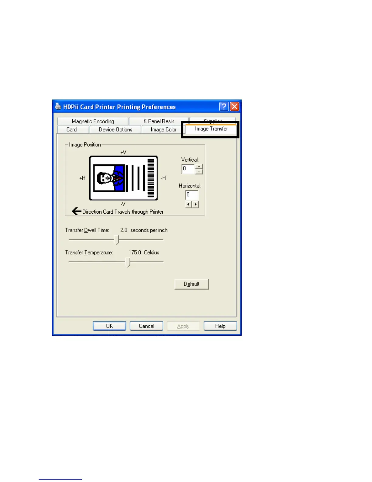 Use this tab to adjust the Image Position, Transfer Dwell Time and Transfer
