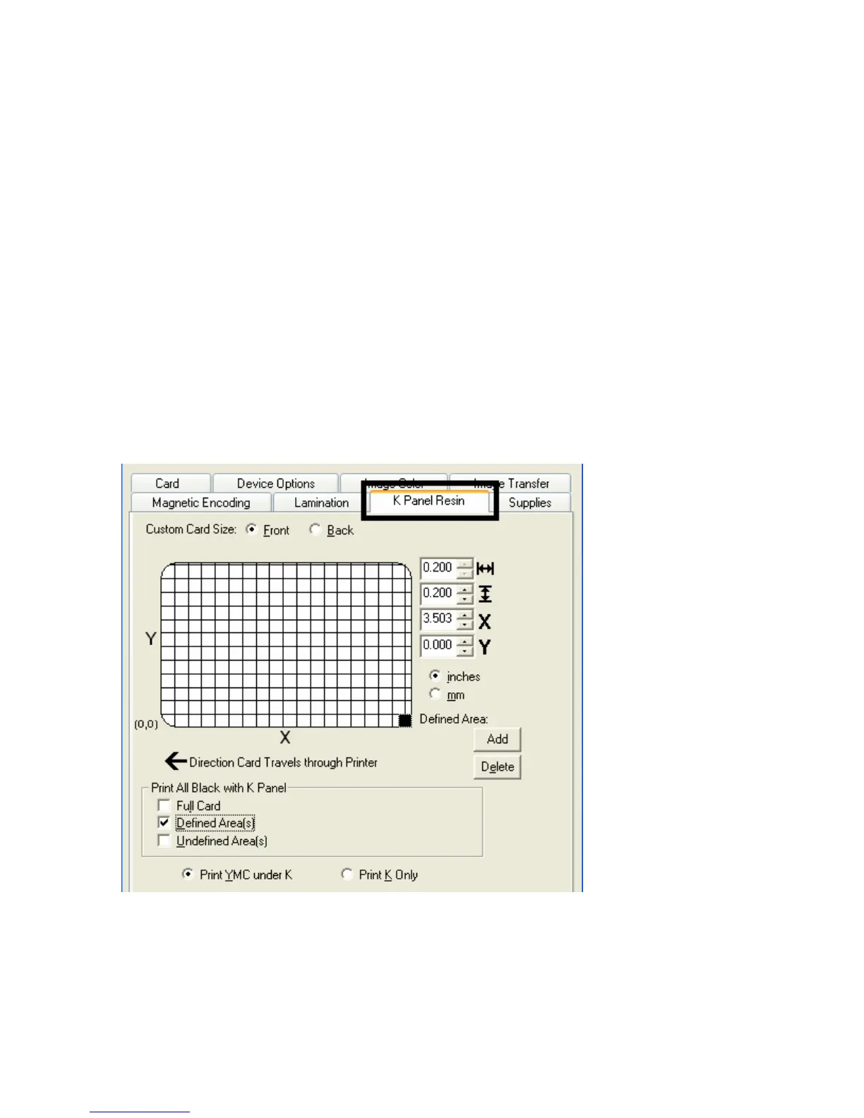 Use this tab to adjust the Card Size, the Direction the Card Travels through the Printer, the