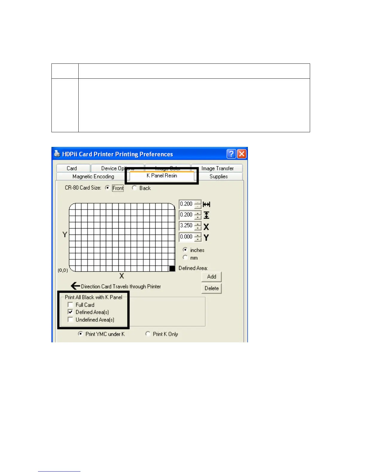 1 Select the Defined Area(s) option to print the resin black (K) Panel for all