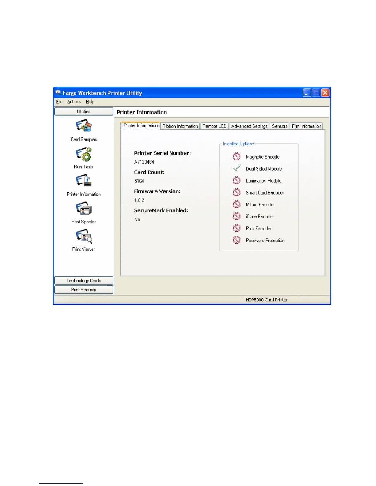 Display B – Fargo Workbench Printer Utility (Printer Information tab)