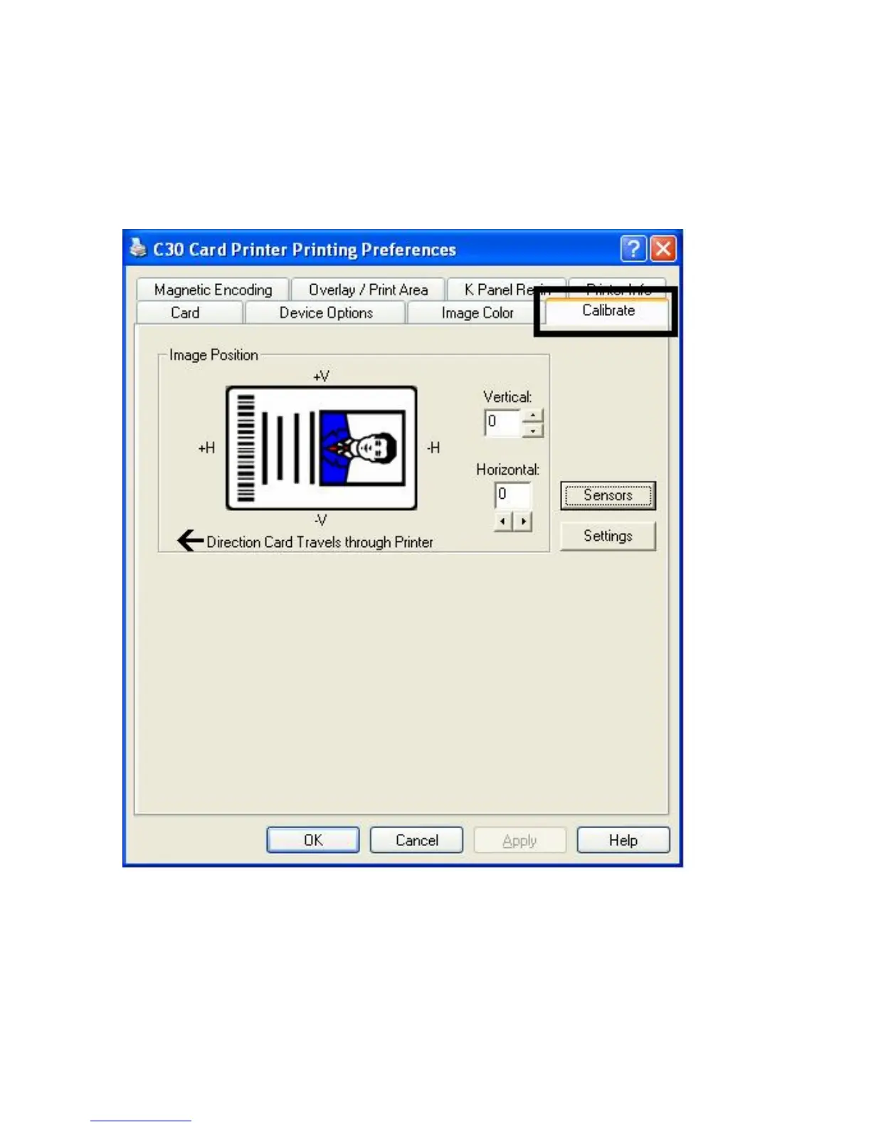 Use the Calibrate tab to (a) control the position of the printable area in relation to the card,