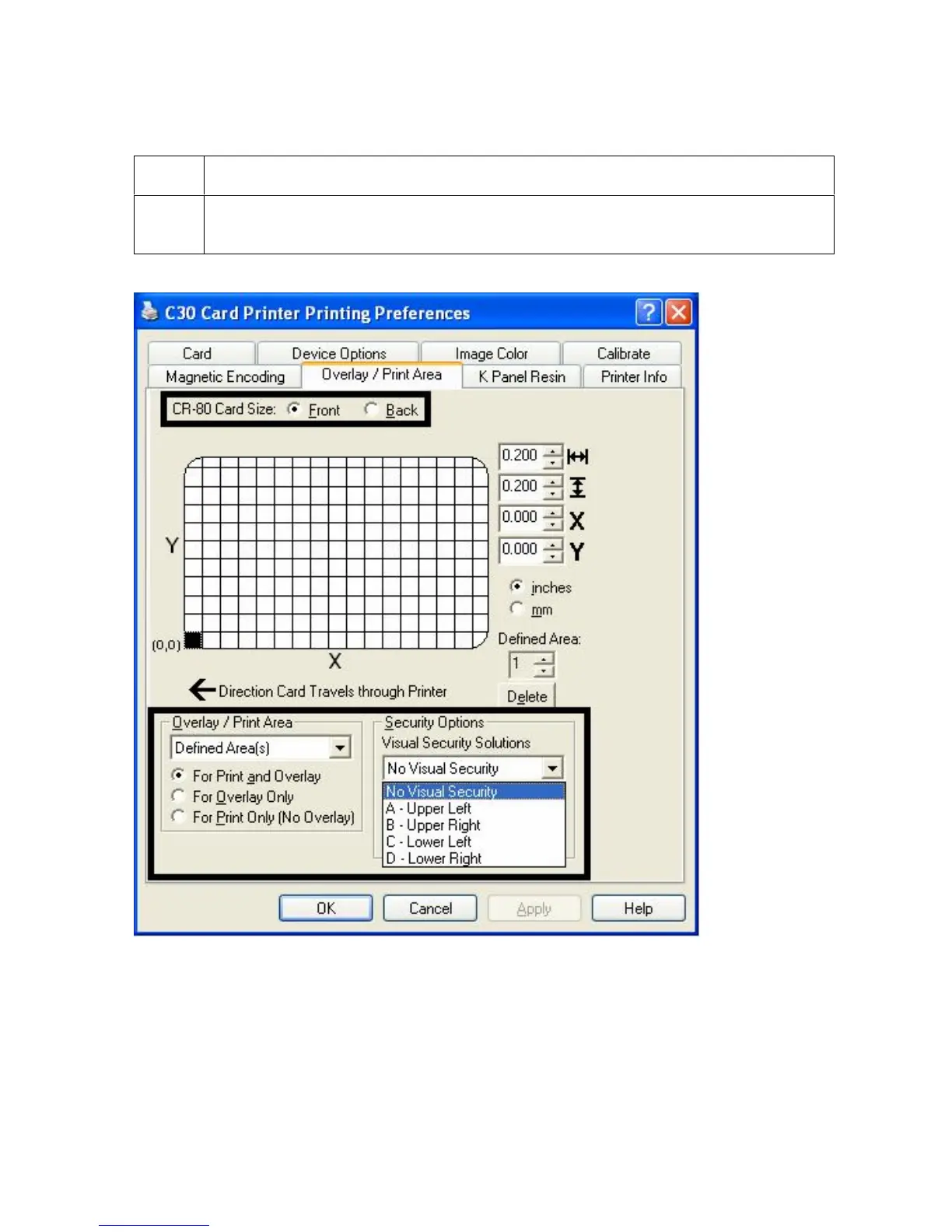 Select the Front radio button, which enables the Overlay / Print Area and
