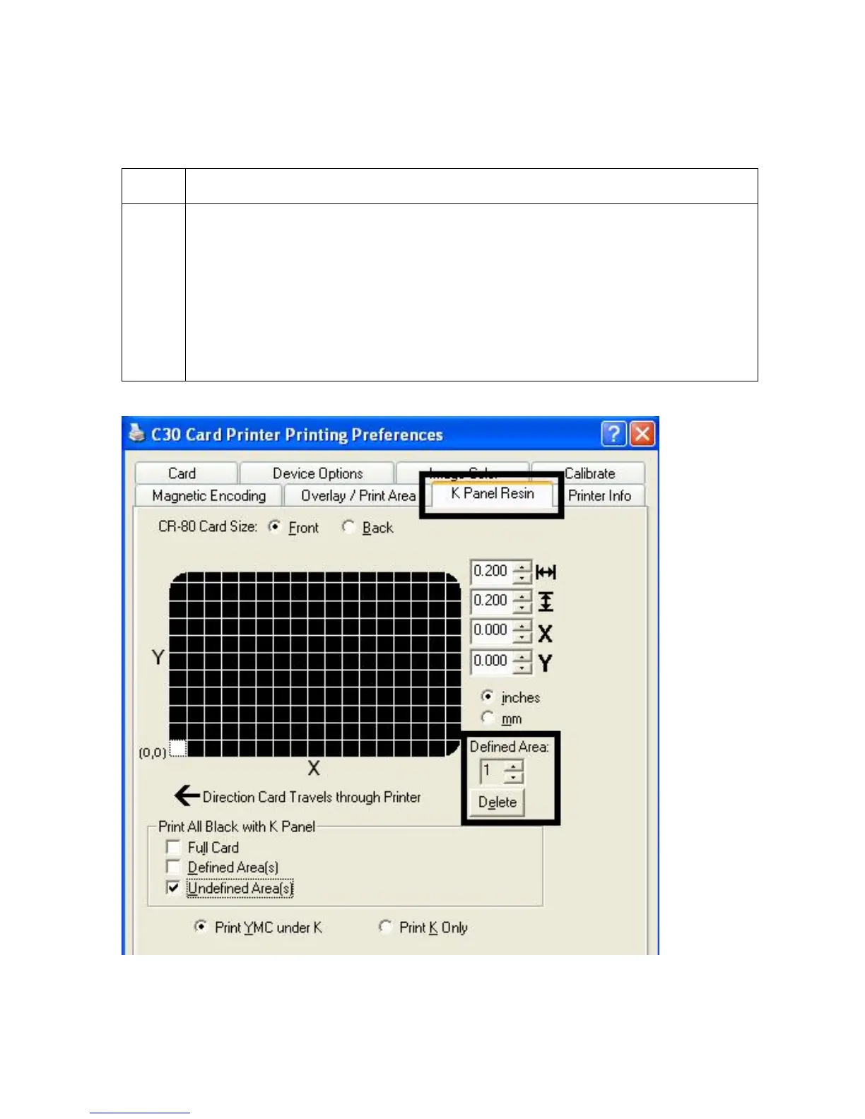 Selecting the Defined Area(s) function (Front and Back options)