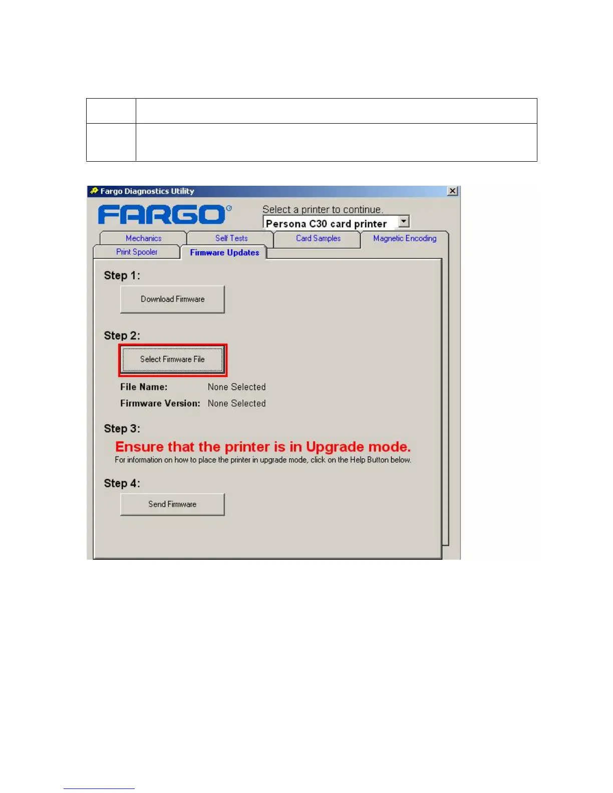 Click on the Select Firmware File button under Step 2: in the Fargo Diagnostic