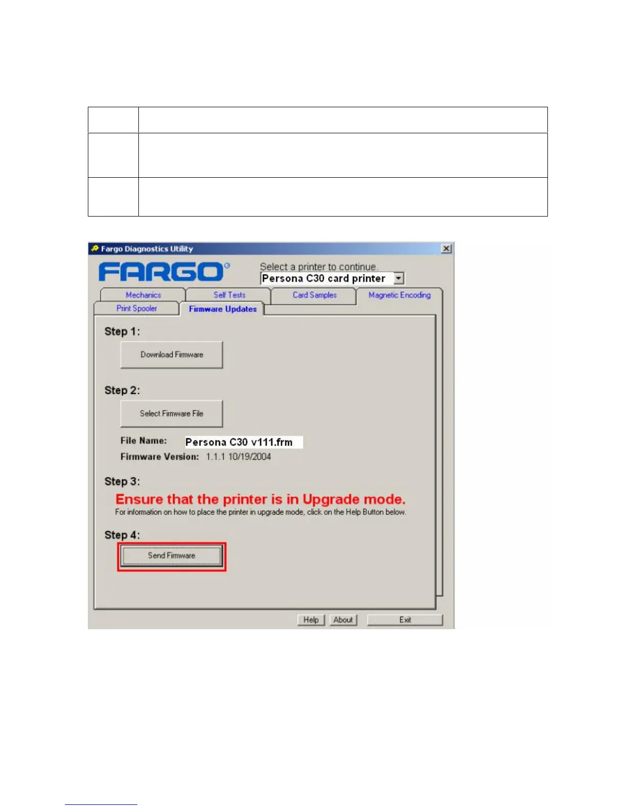 From the Fargo Diagnostic Tool, click on the Send Firmware button, as shown