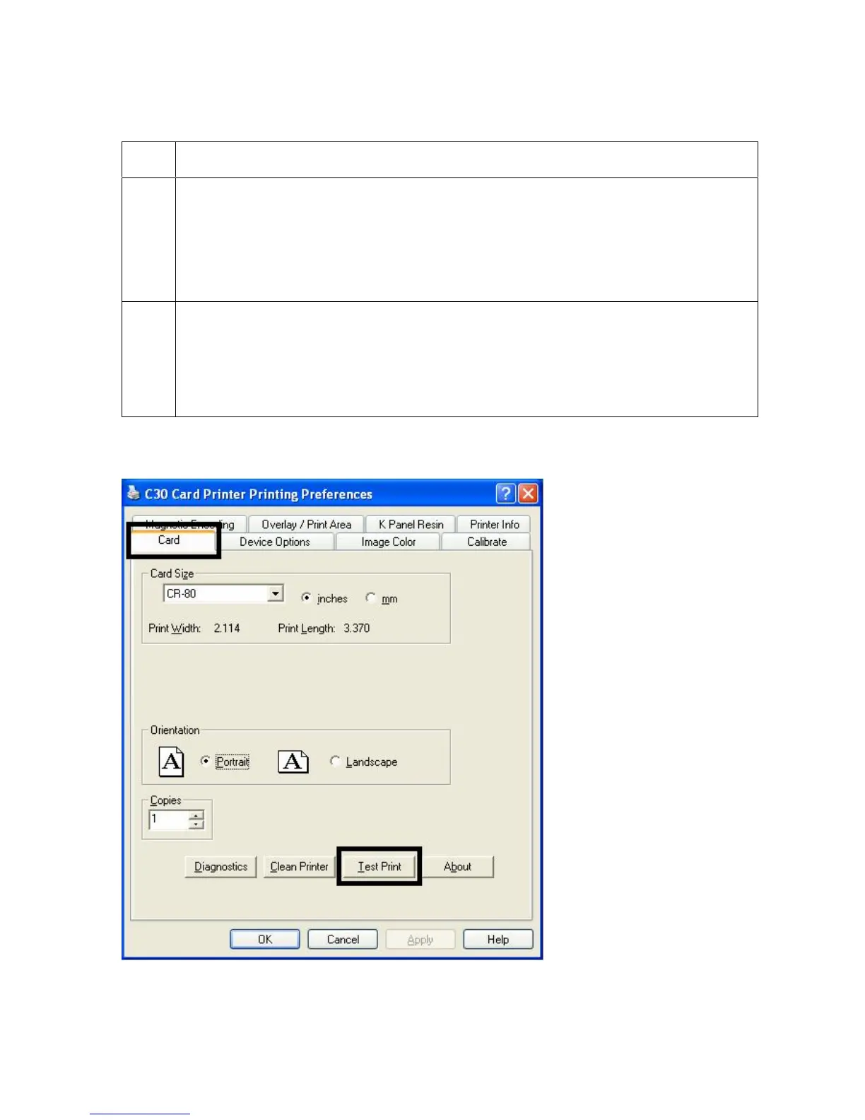 a. Select the Card tab, and then click on the Test Print button, as shown in
