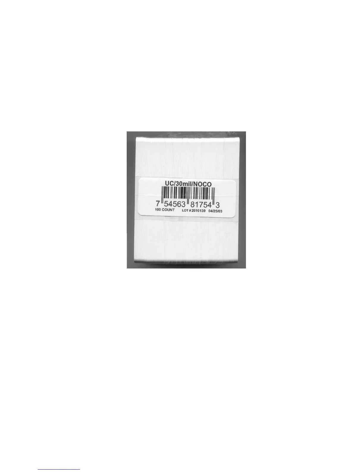 on the bar code label attached to the shrink-wrapped stack of 100 cards, as shown