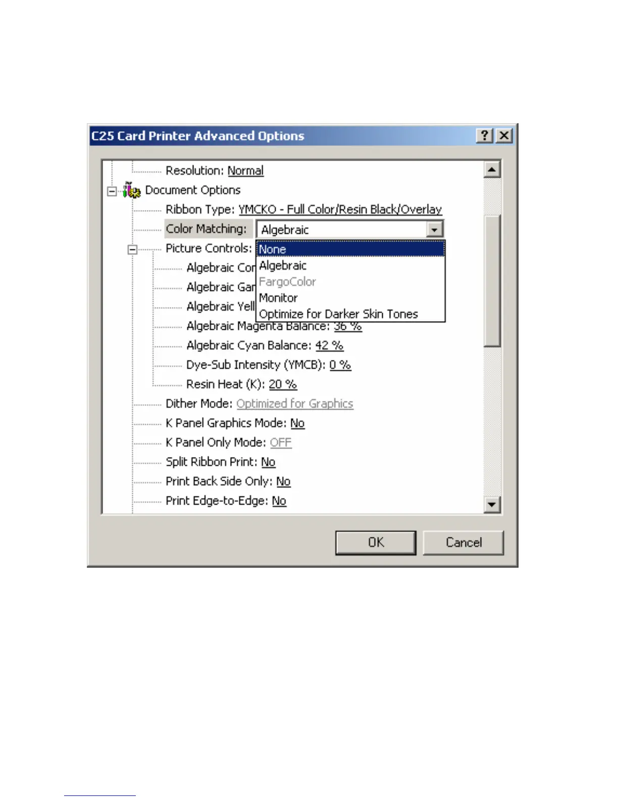 Selecting from the Color Matching options (continued)