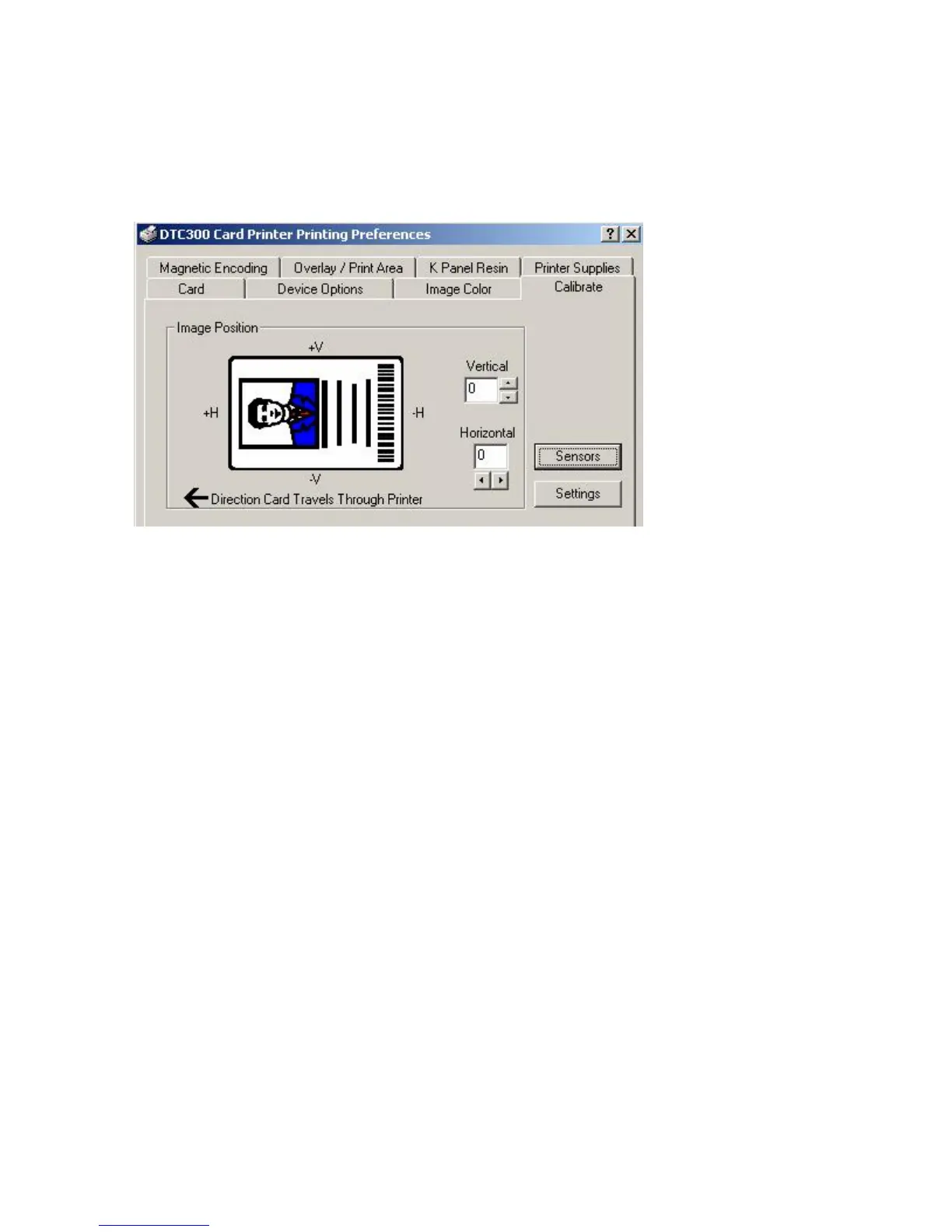 Use the Calibrate tab to (a) control the position of the printable area in relation to the card,