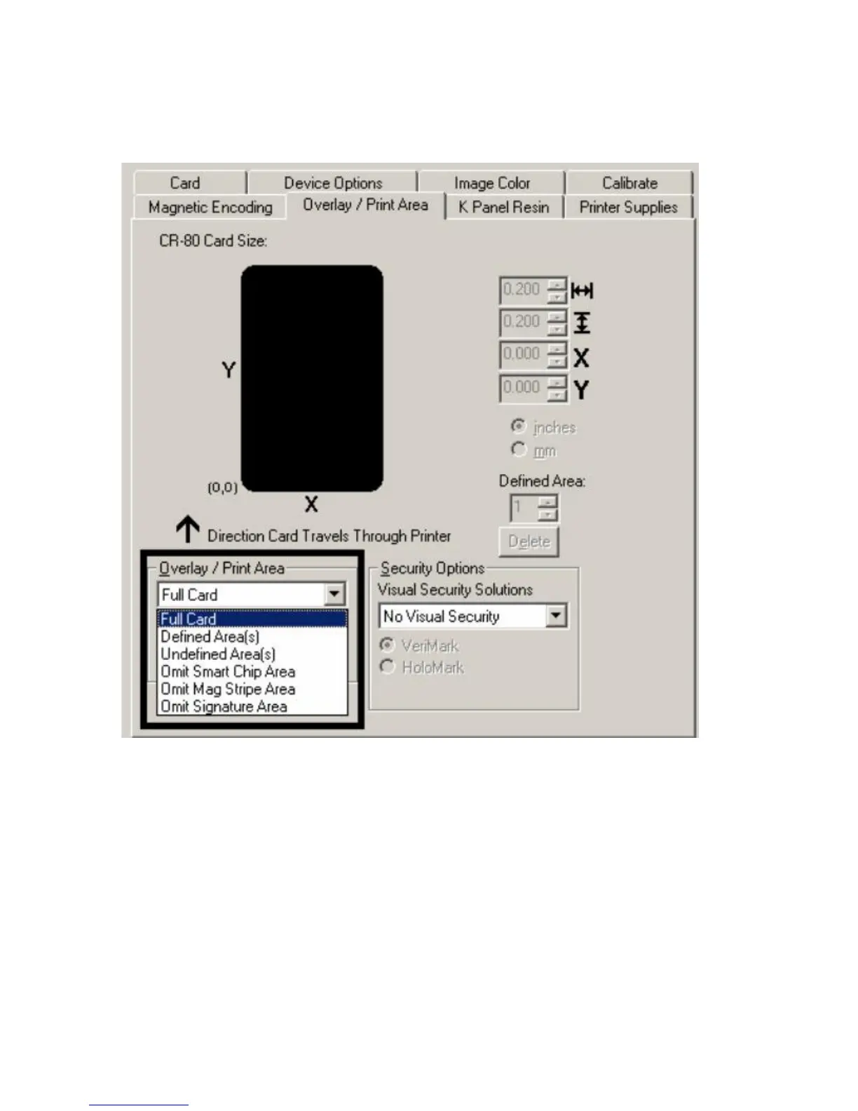 Fargo DTC300 - Using the Overlay; Print Area Dropdown Menu (Continued)