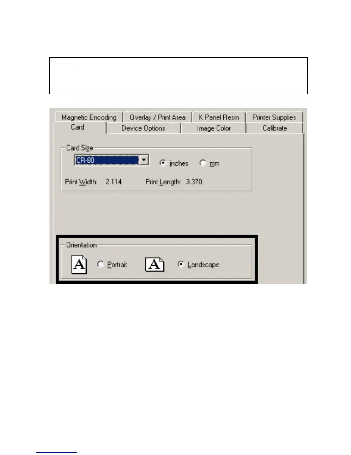 Selecting Orientation - Landscape under Card tab