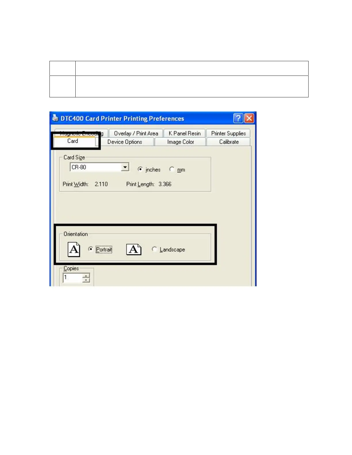 Selecting Orientation - Portrait under Card tab
