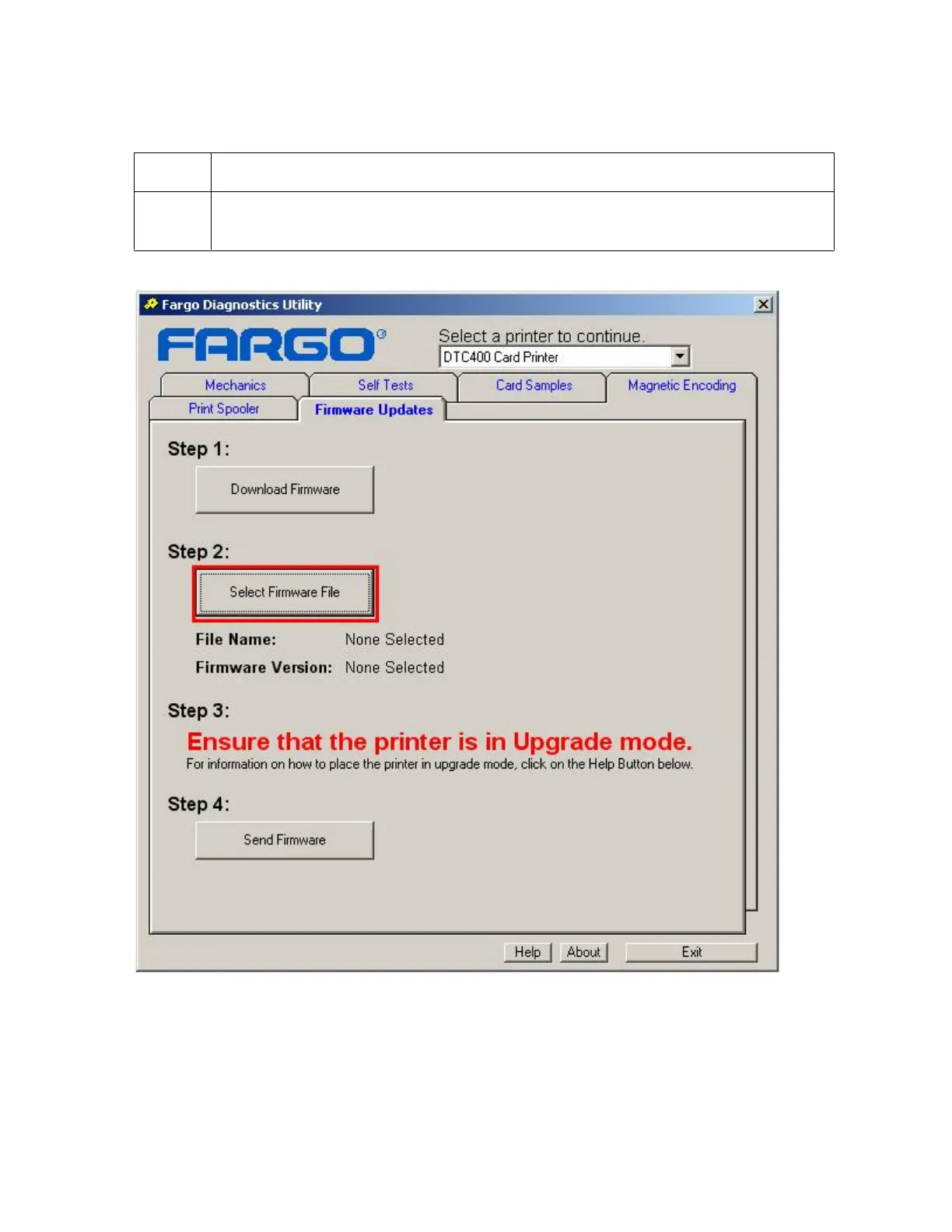Click on the Select Firmware File button under Step 2: in the Fargo Diagnostic