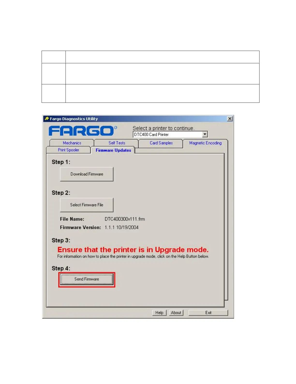 2 From the Fargo Diagnostic Tool click on the Send Firmware button, as shown