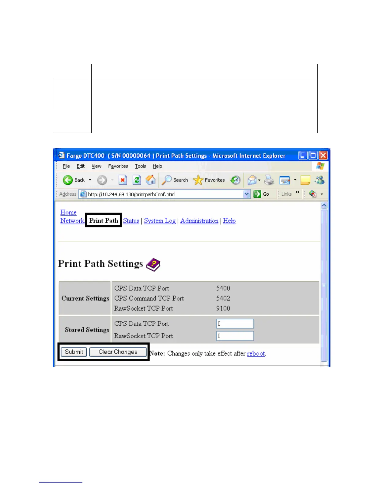 4 Select the Submit button to save these changes to stored settings in the