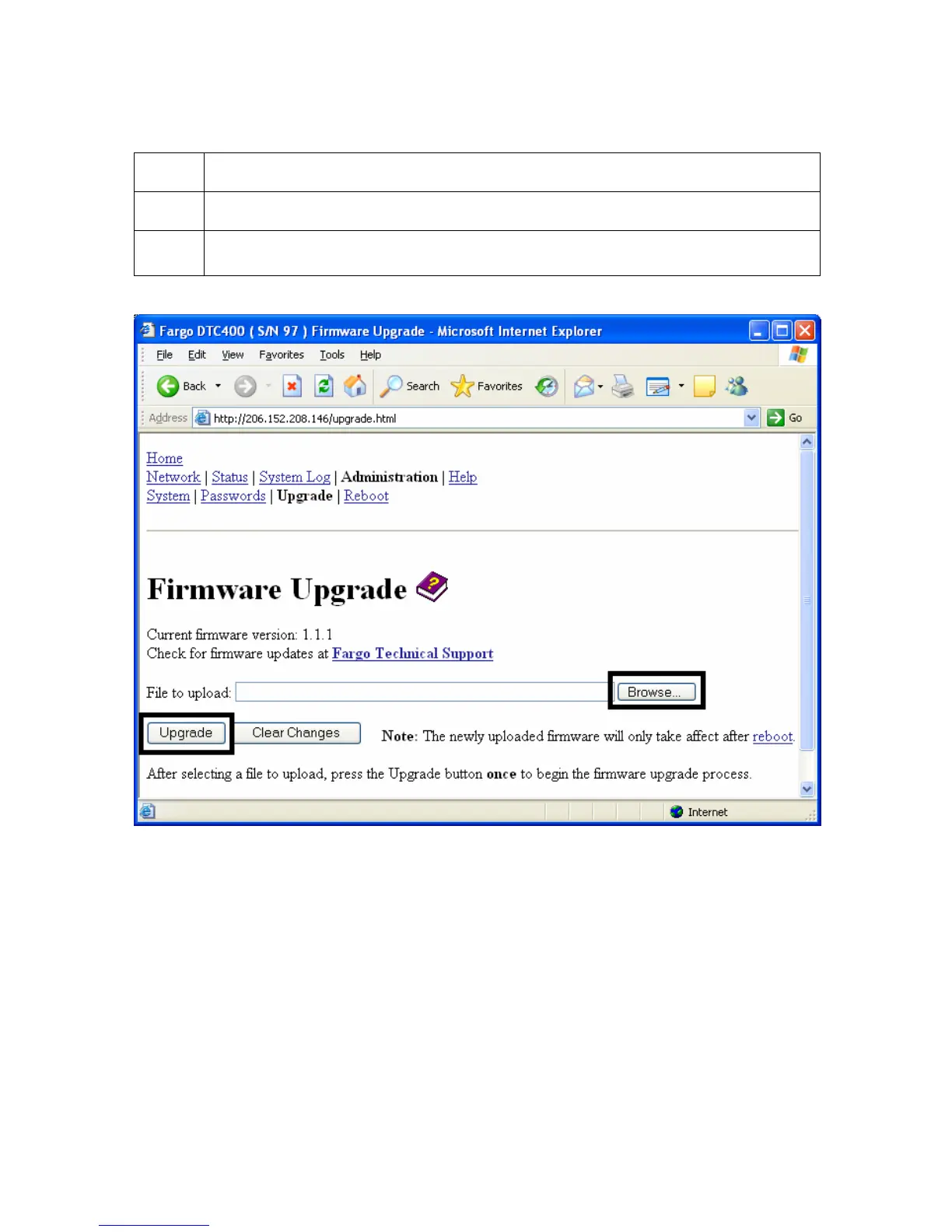 6 Select the Upgrade button to start the Firmware upload.