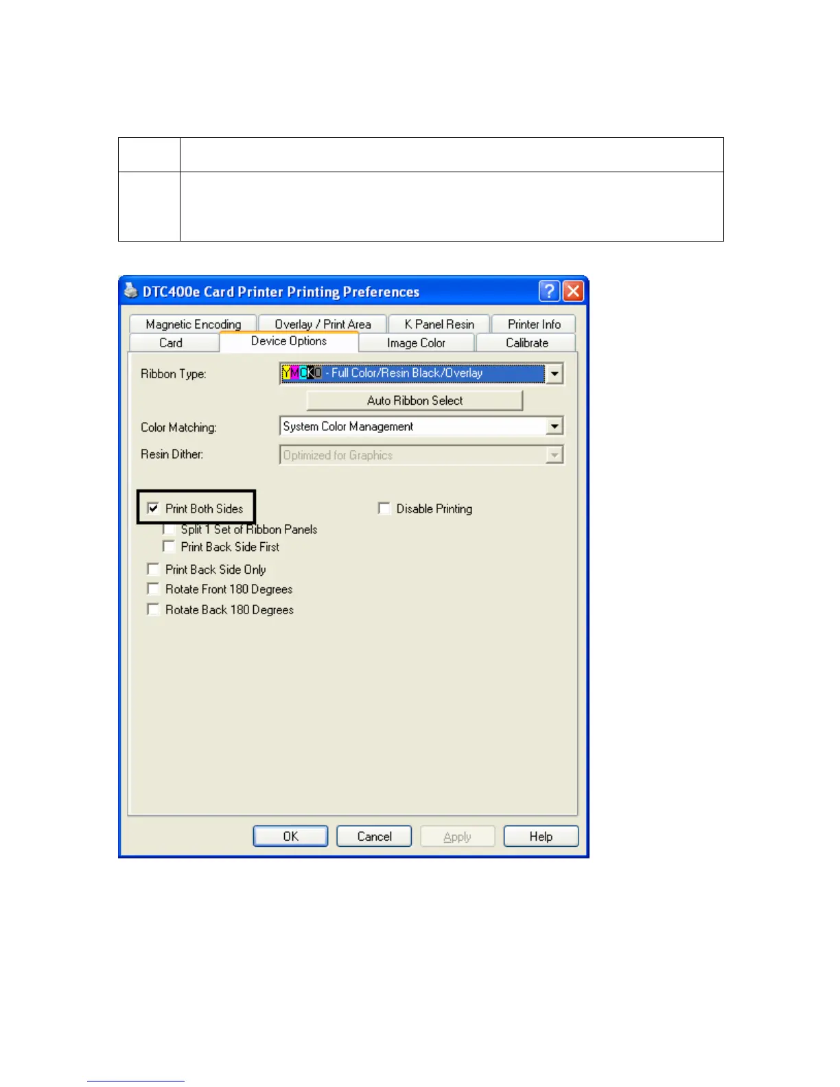1 Select Print Both Sides under the Device Options tab to enable the Backside