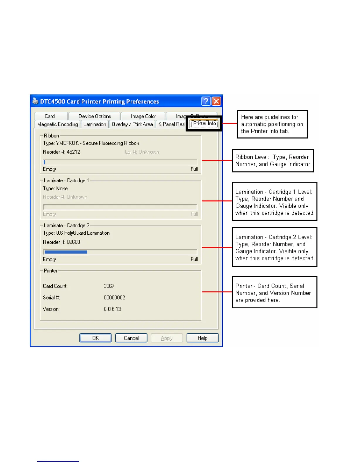 Use the options on this tab to view information about the Ribbon, Laminate, Card Count, Printer Serial #,