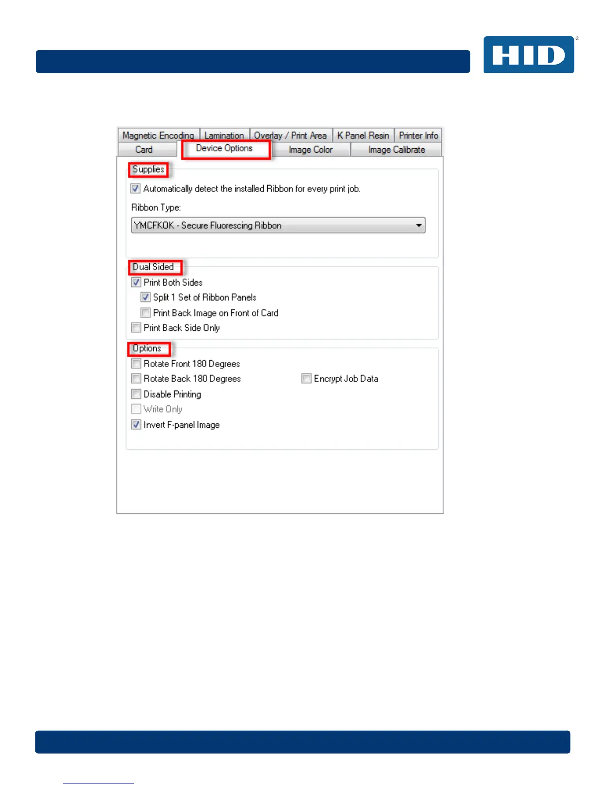 Click Device Options to display the Supplies, Dual Sided and Options areas.