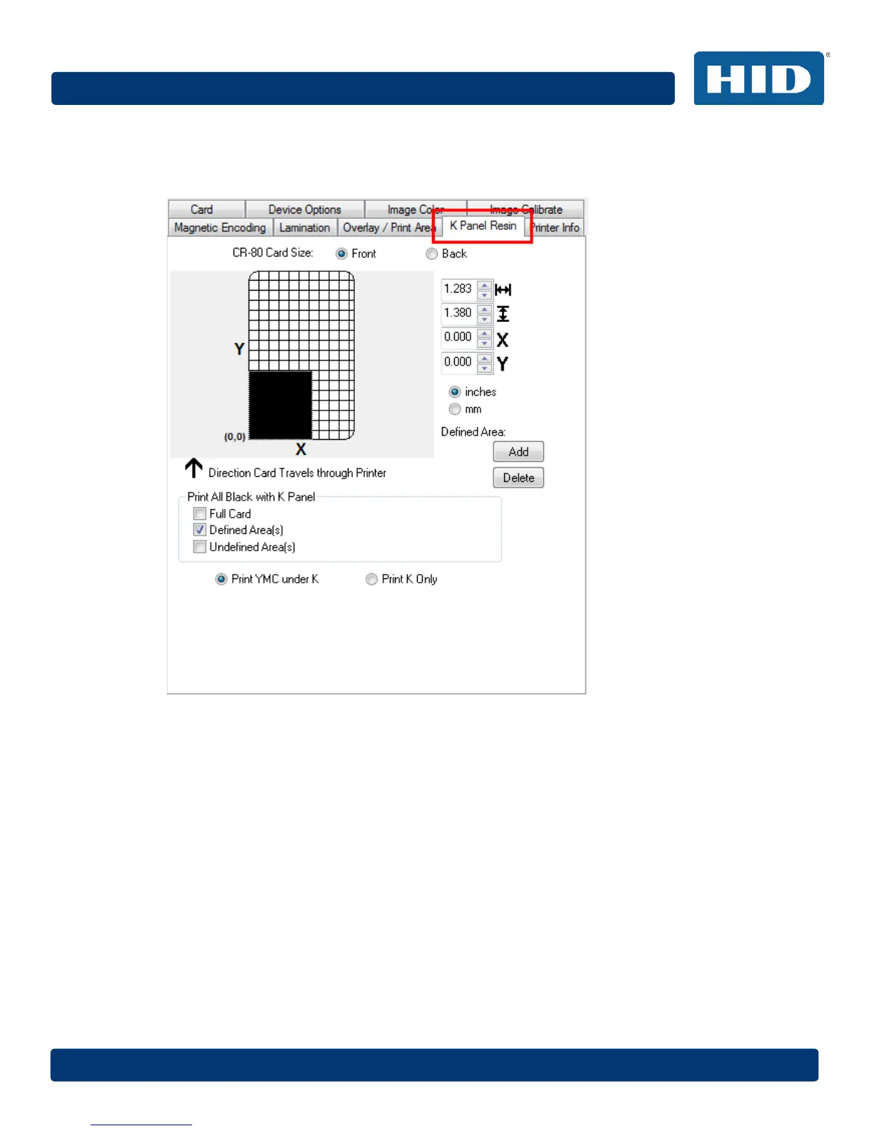 Use this tab to control where the resin black (K) Panel of a full-color ribbon is printed. If a ribbon