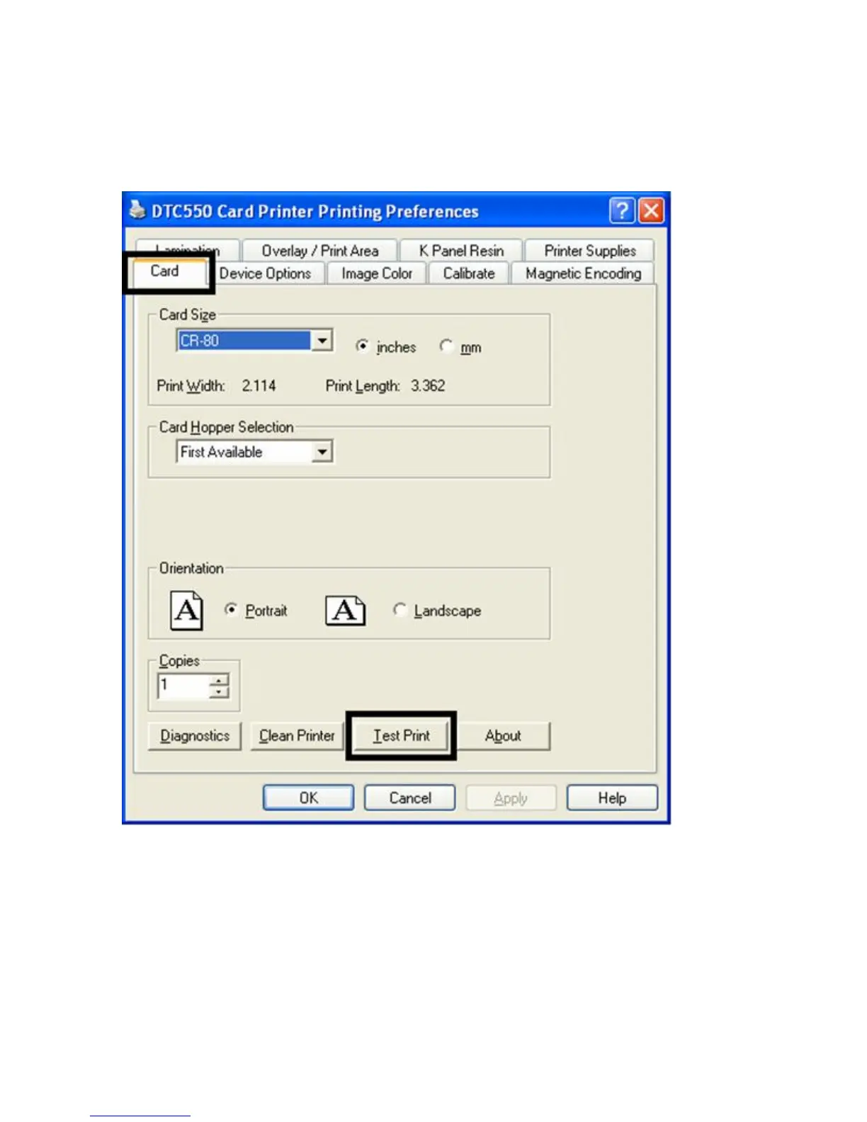 Display A - DTC550 Printer Driver Card tab (see below)