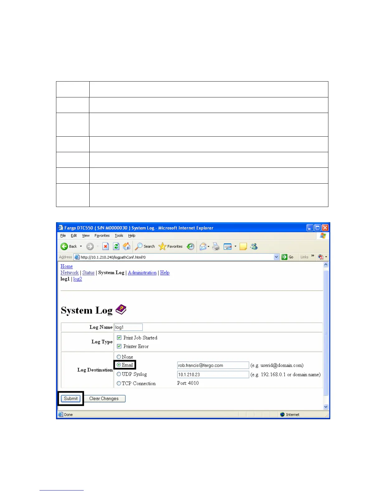 3 Select the Email radio button to choose email log notification.