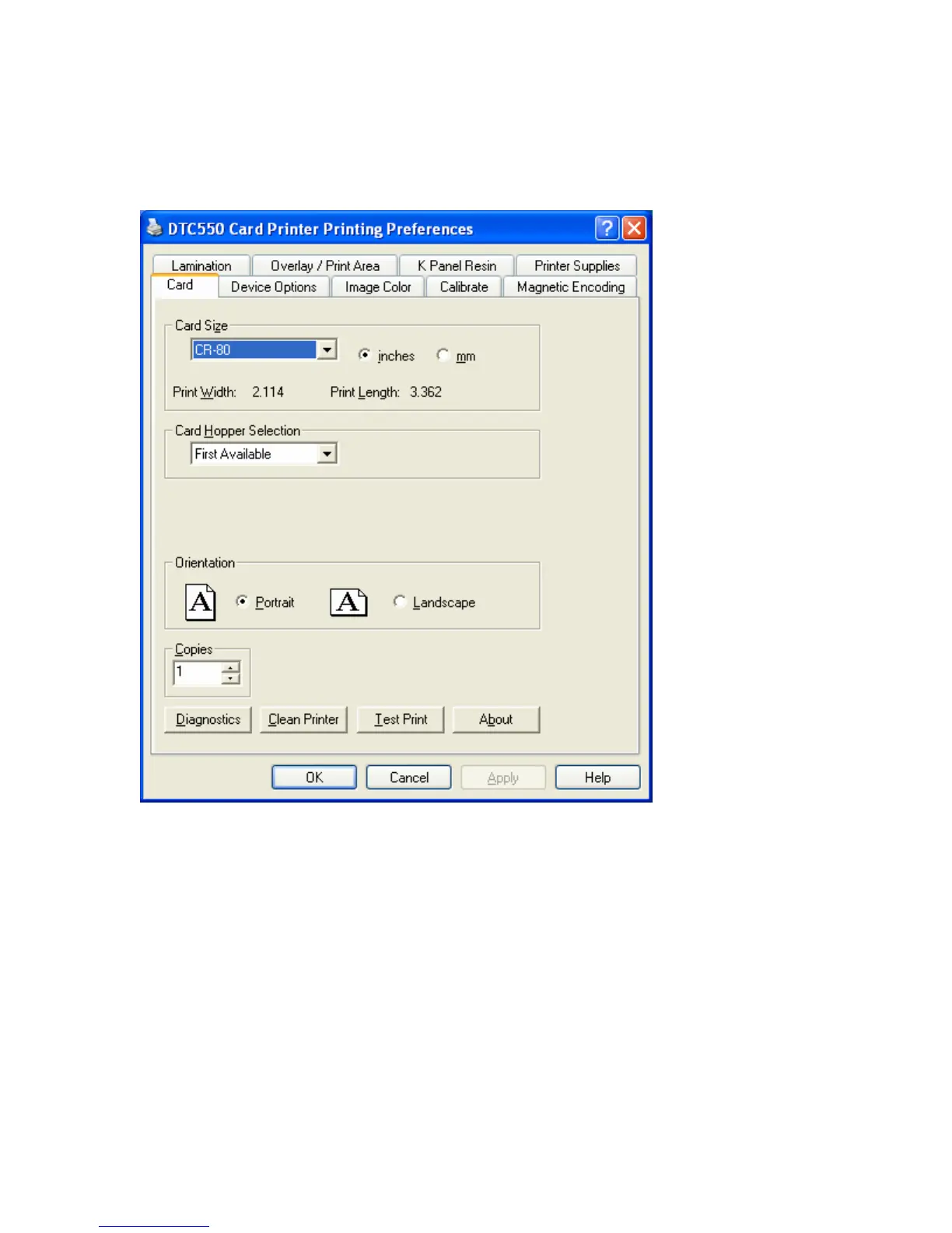 Display A - Card tab (DTC550 printer driver)