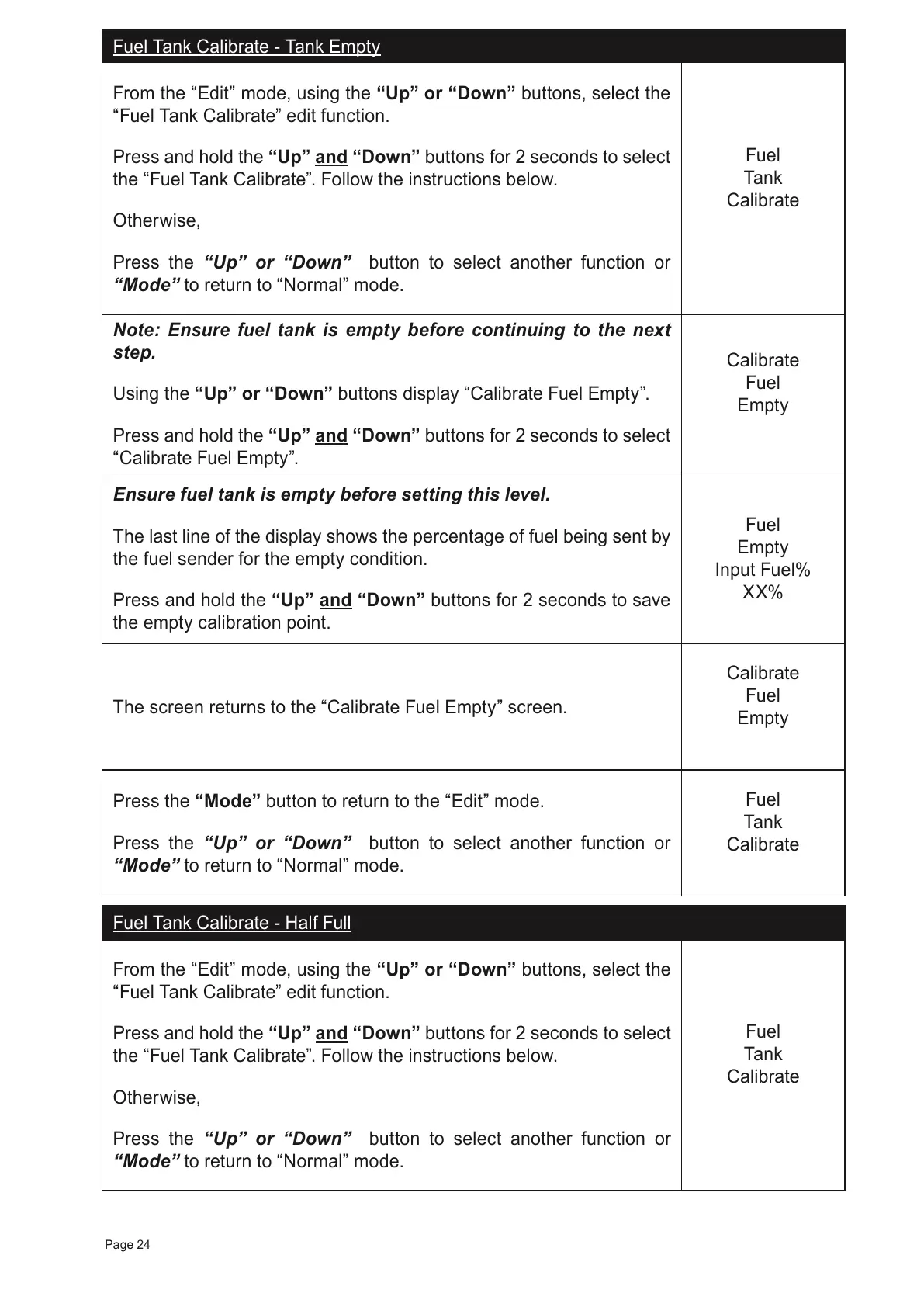 Using the “Up” or “Down” buttons display “Calibrate Fuel Empty”.