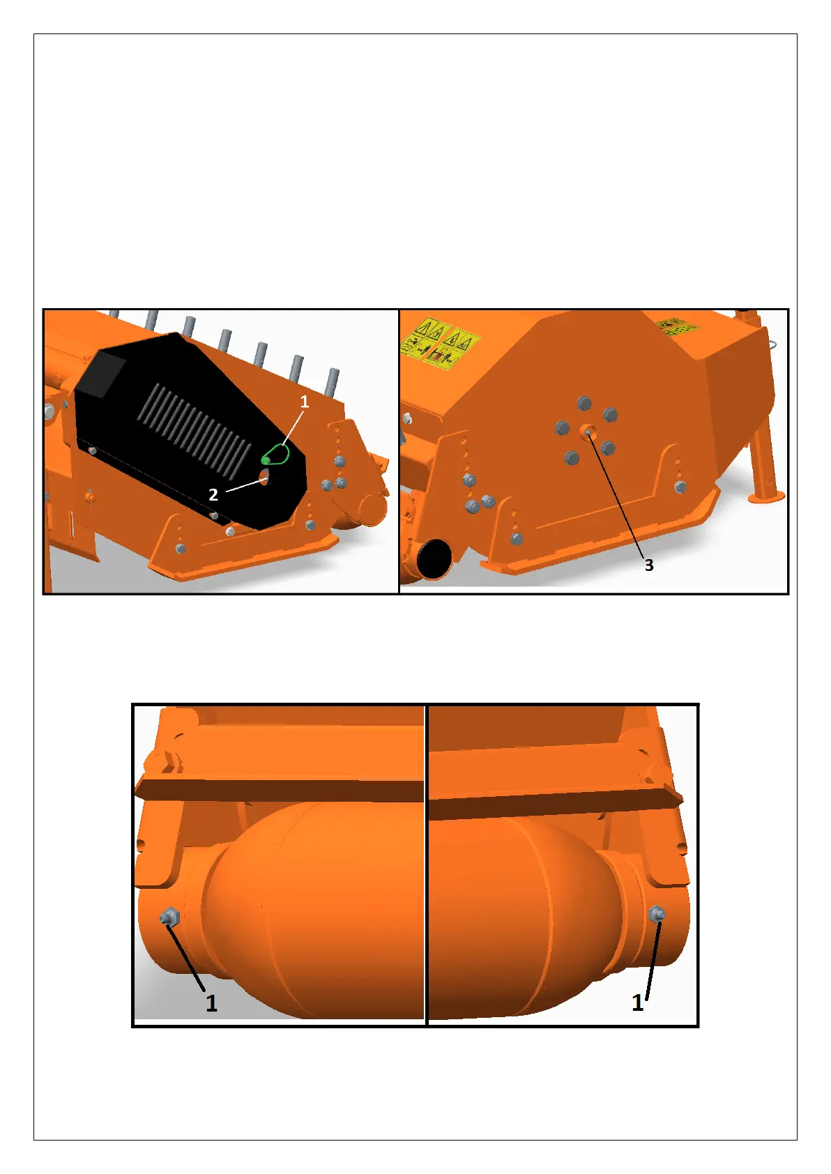 To perform lubrication, inject grease into the nipples (1) and (2), located on the upper part of the roller