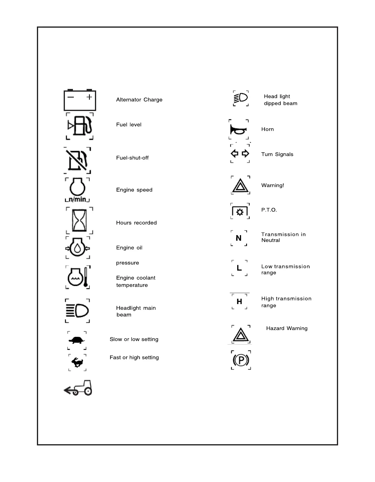 As a guide to the operation of your tractor, various universal symbols have been utilized on the instruments,