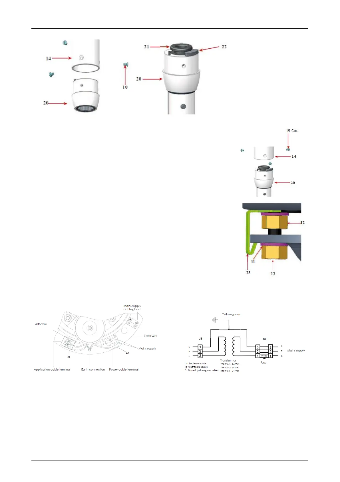 T. Fit the lamp on the column (14) and fix it with the three screws (19); make sure the bores of