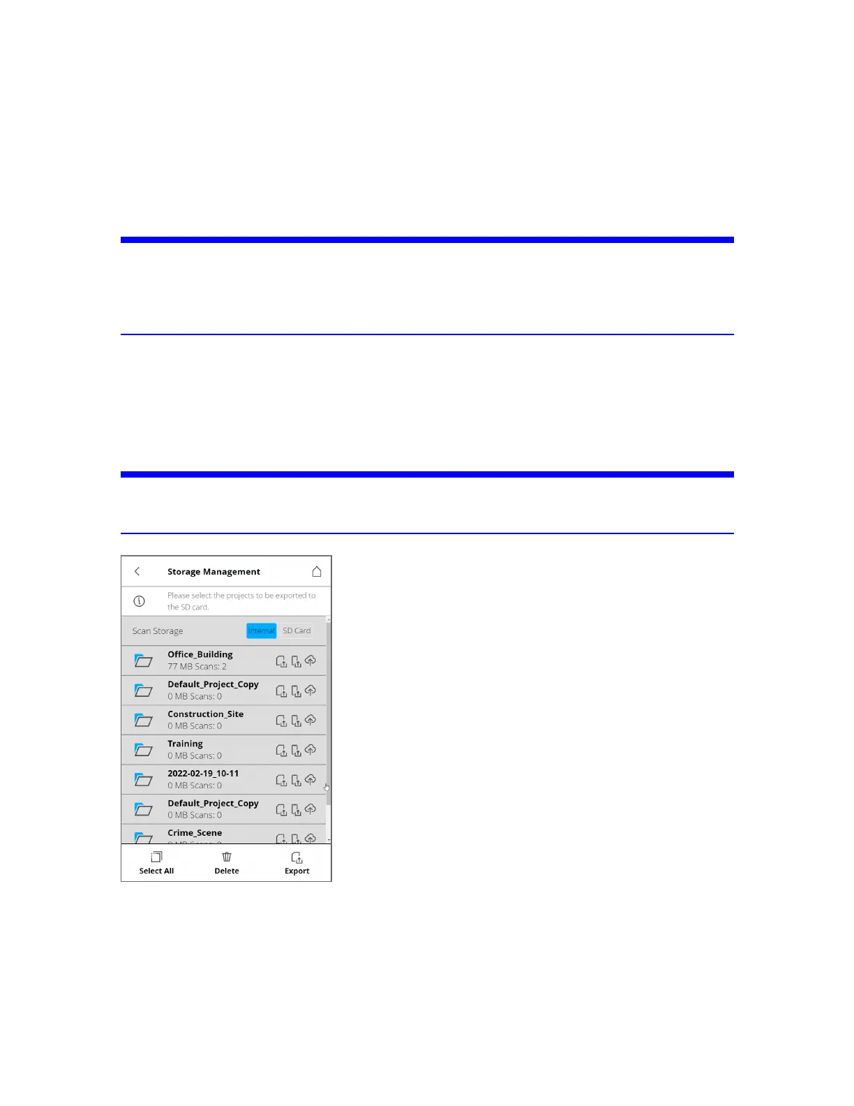 If you select Internal scan storage, you can delete scan projects, or can manually export them to the