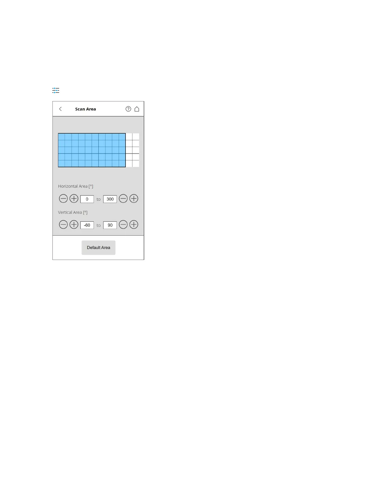 Vertical area - The size of the vertical scan area in degrees. Tap the fields to enter the values of the