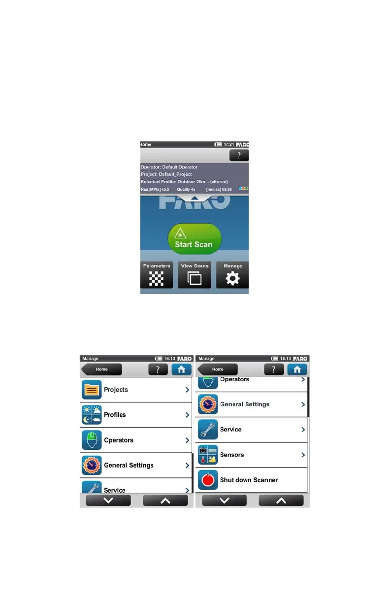 Manage button - Manage scan profiles, projects, operators and the scanner.