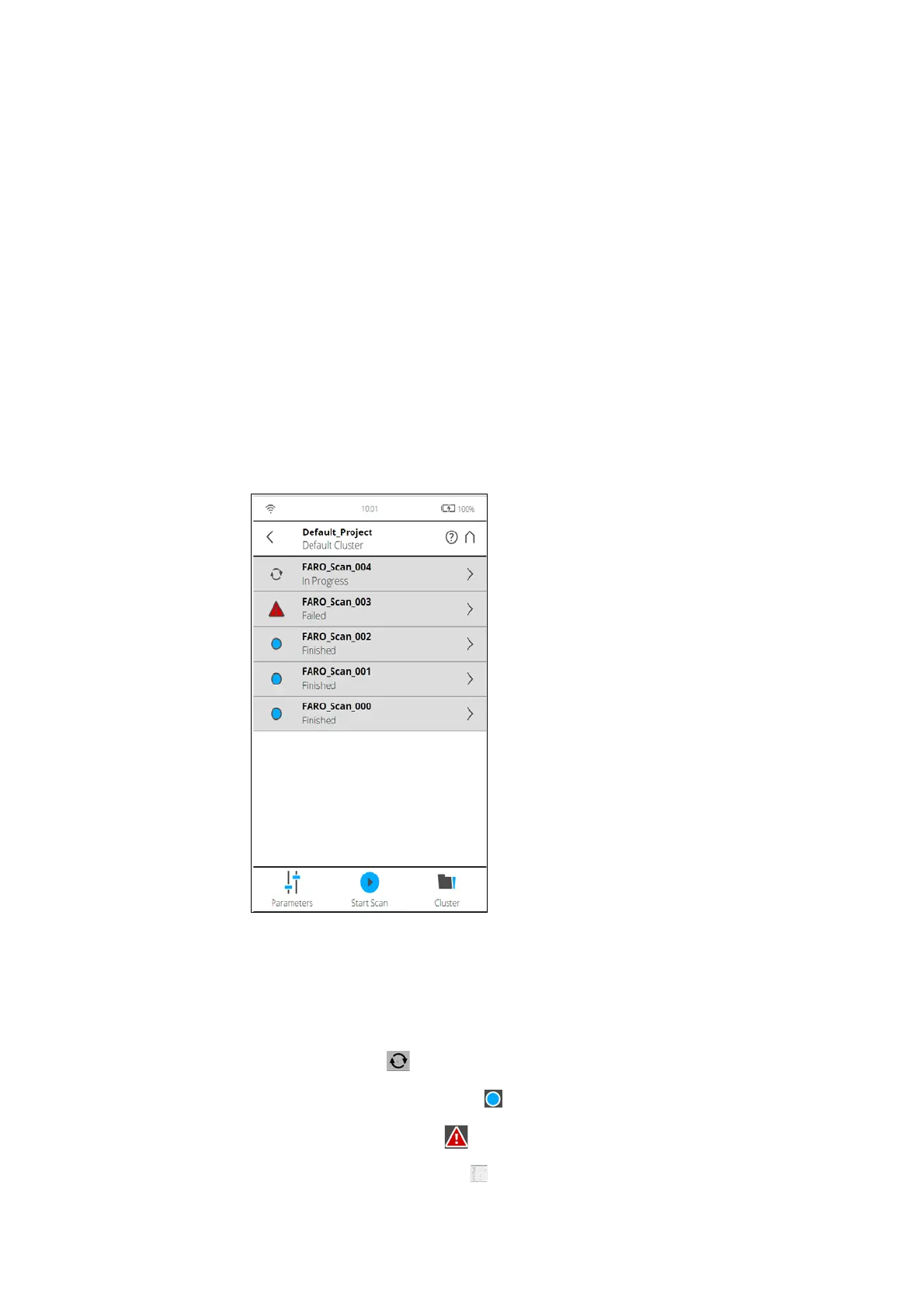 status of each scan is shown on the left of the page. Tap on the right arrow to