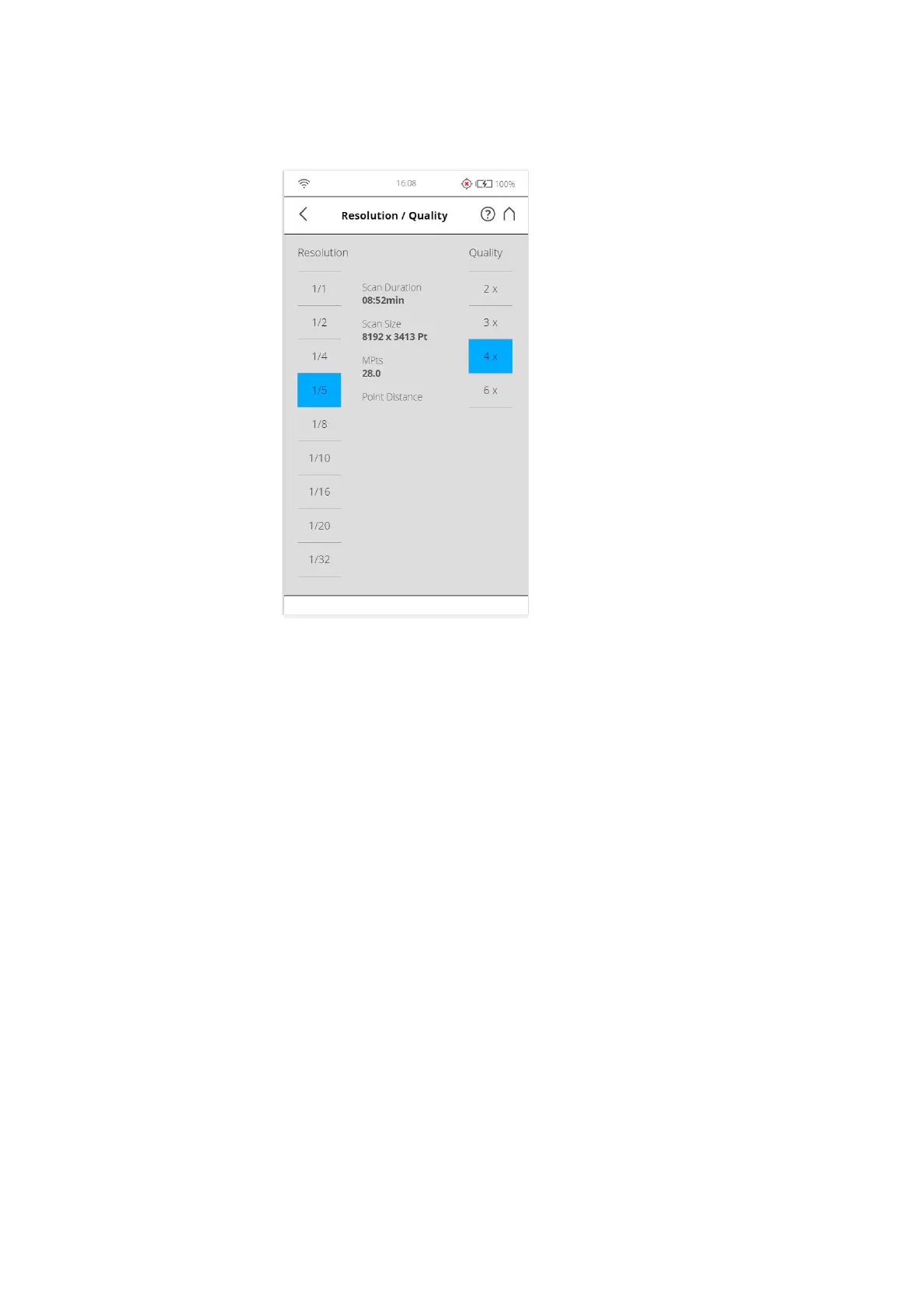 Displays the selected resolution in megapoints, and the selected quality. Tap