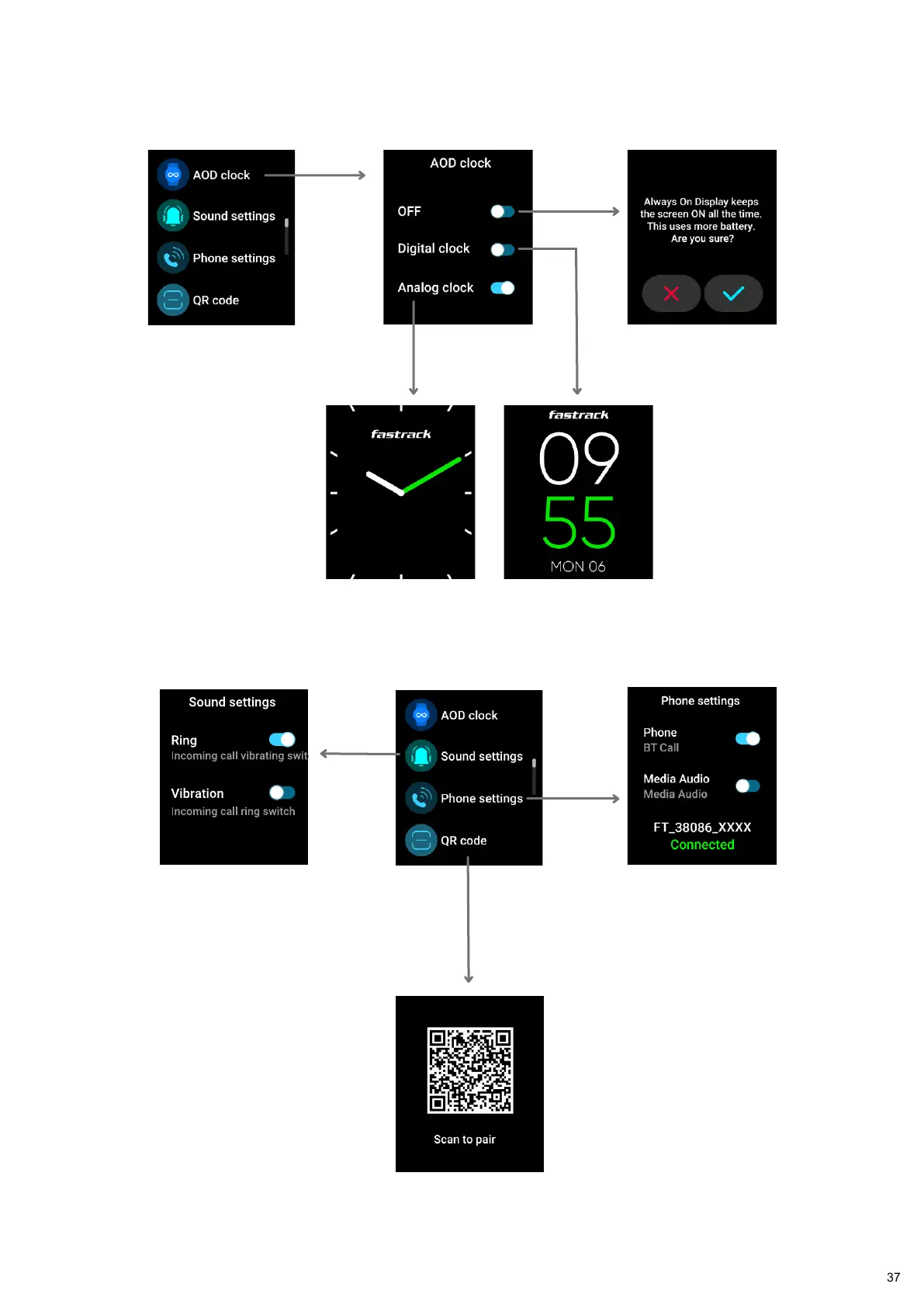 Fastrack 38086 - AOD Clock and Display Options; Configuring Always-On Display; Sound Settings, Ring, and Vibration; Customizing Call Alerts